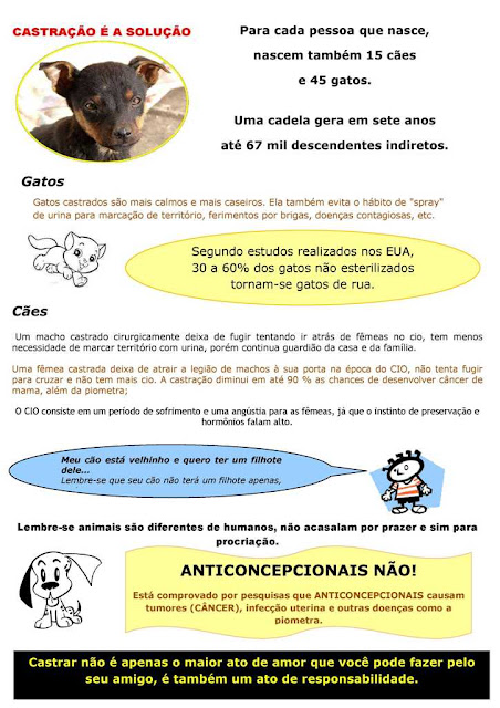 A prática de esterilização previne muito mais sofrimento e prejuízo do que são impostos aos animais pela esterilização. Lembre-se também de não comprar filhotes nos pets-shop ou canis.